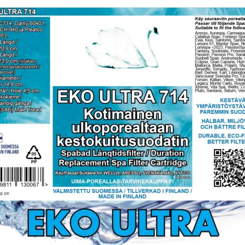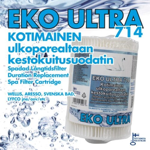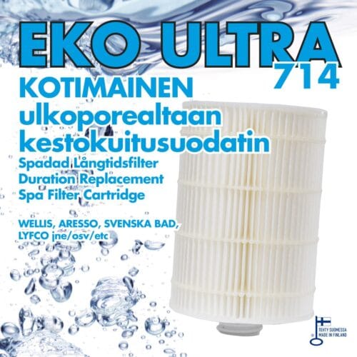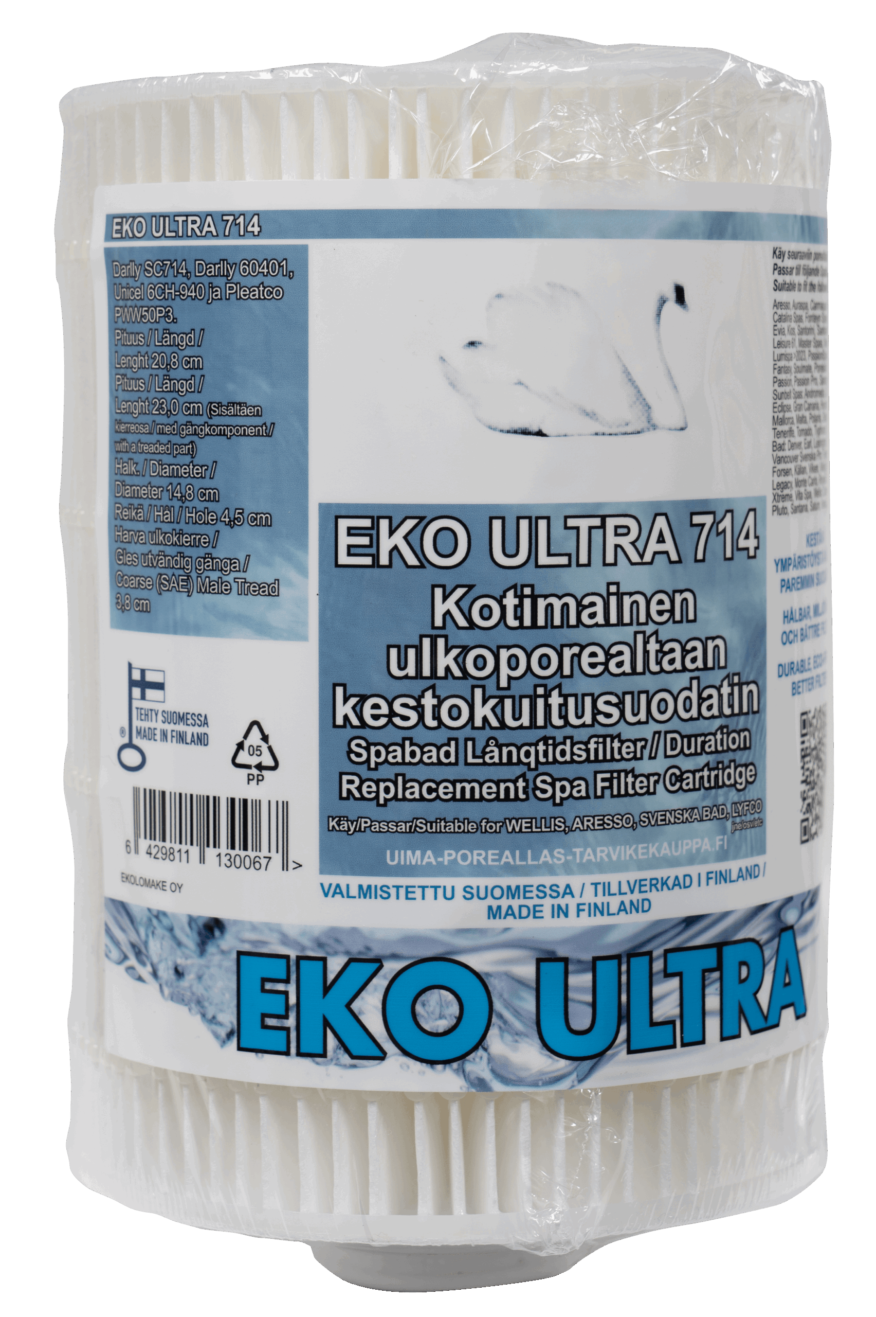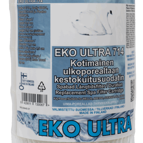 EKO ULTRA 714 spabadlångtidsfilter är utvecklat och tillverkat i Finland som en Nyckelflaggprodukt med utmärkande filtreringsmaterial (ISO 16890). Filterstorleken är 20,8 cm (Längd) x 14,8 cm (Diameter). Längd 23,0 inklusive gängkomponent. Hålets storlek är 4,5cm. Det hållbara och tvättbara filter har en yta på 1,2 m2. Vid tillverkningen av filter har en beprövad genomflödesstruktur och lameller som inte pressas eller fastnar ihop. Pumparna i poolen arbetar med mindre belastning och på så sättet är det möjligt att massagepumparna kan utnyttjas energieffektivt. Återvunna material har också använts vid tillverkningen av filter och det kan förstöras genom förbränning efter användning. Obs! Innehåller varken mikroplast eller PVC-plast.